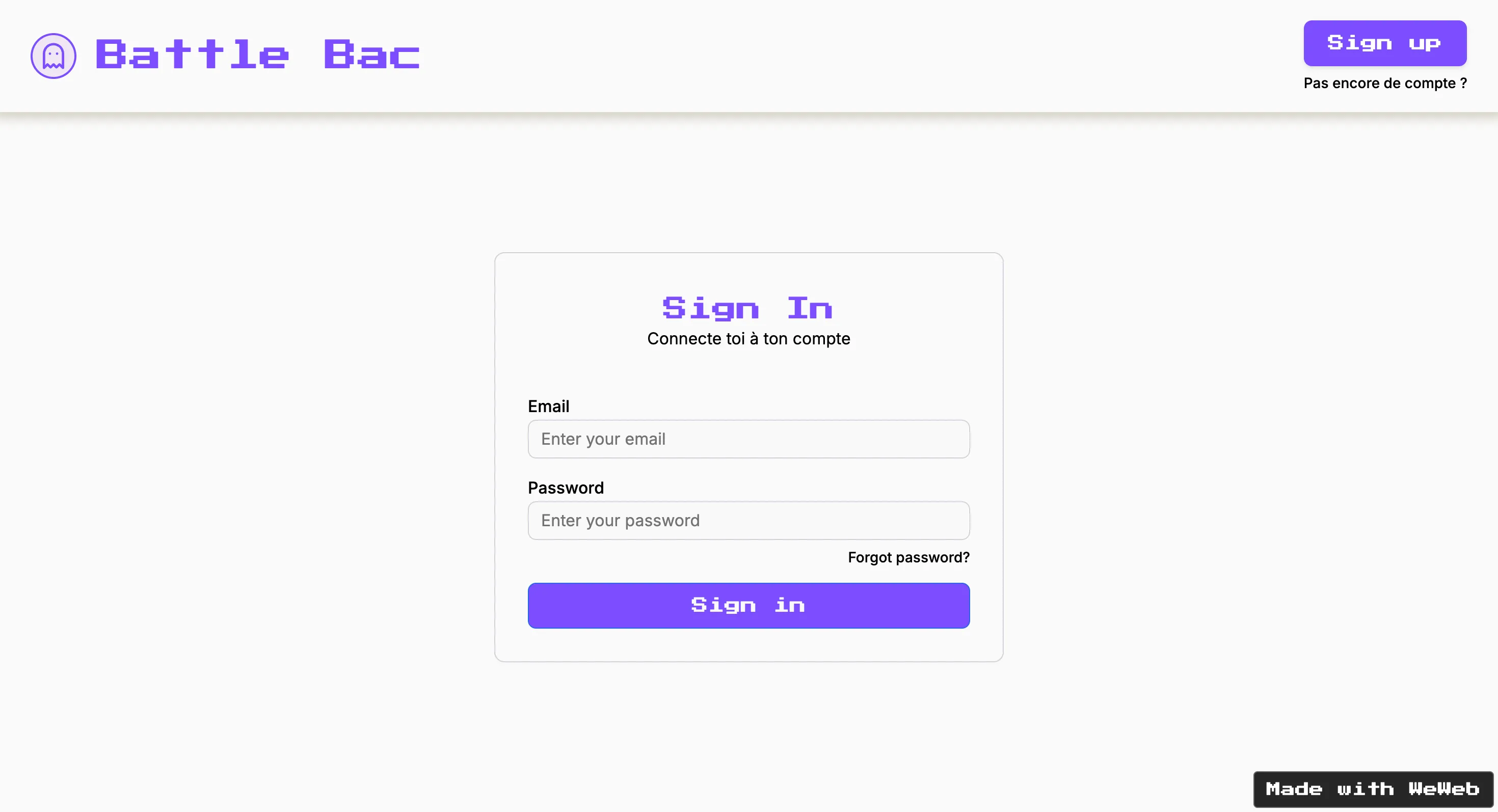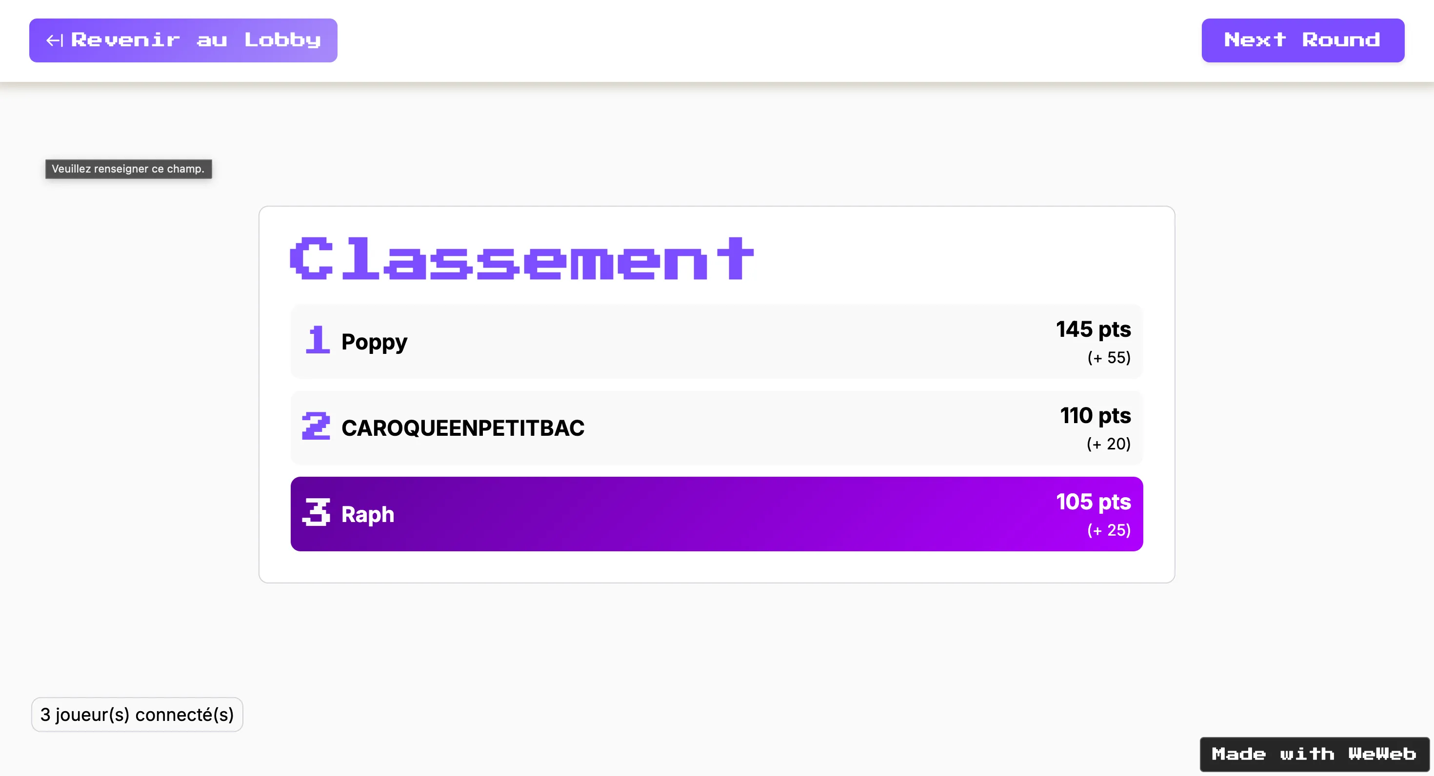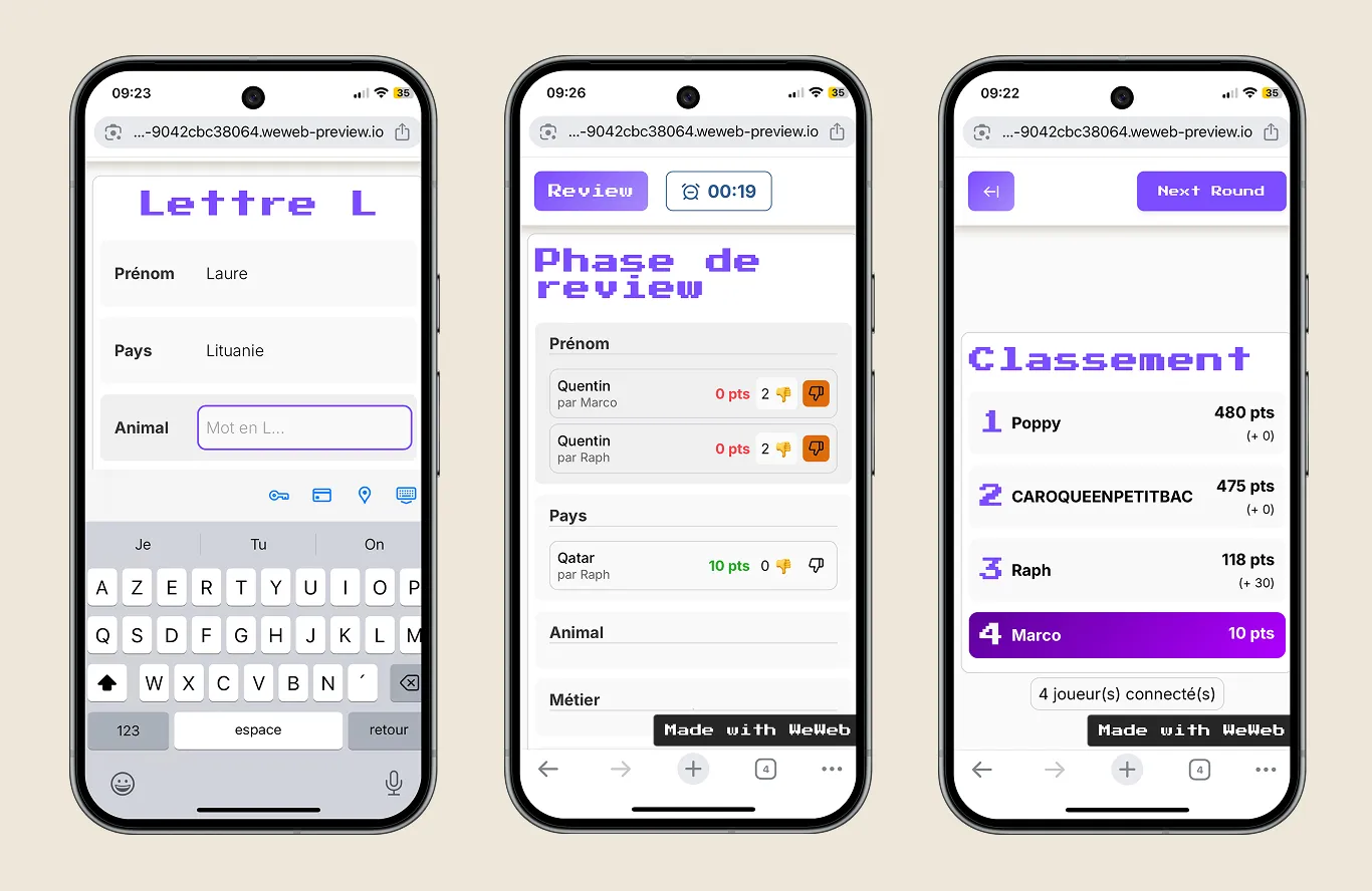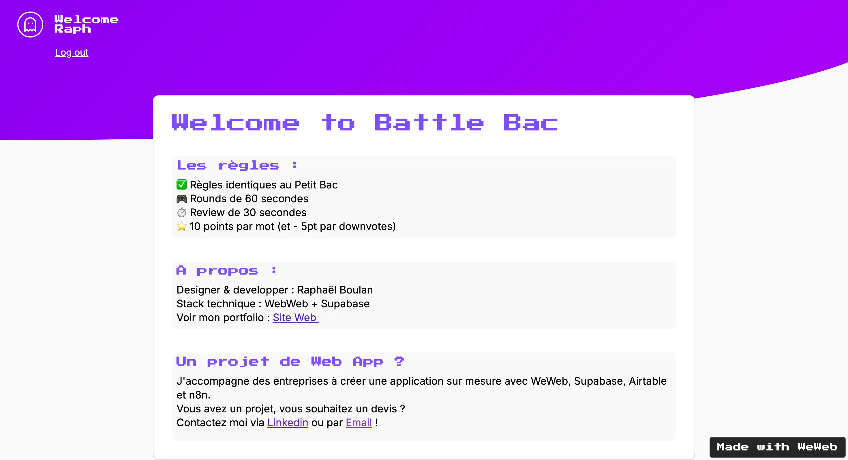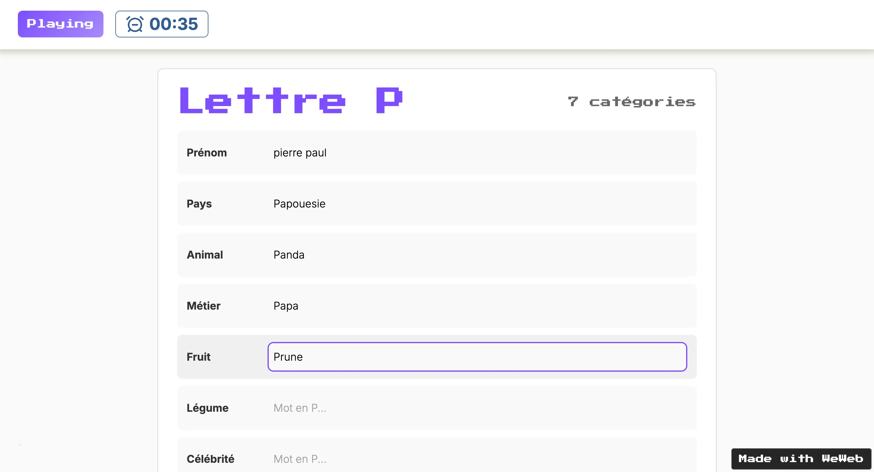Build d'une application du jeu du petit bac. Objectif : Réinventer le jeu du petit bac tout en utilisant les technologies realtime de Supabase avec WeWeb.